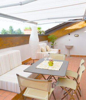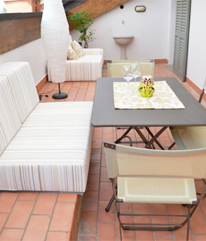 Made of customized furniture to transform an unattractive and unnecessary step into an element of furniture to make the most of the space of a beautiful terrace overlooking the cremaca countryside.